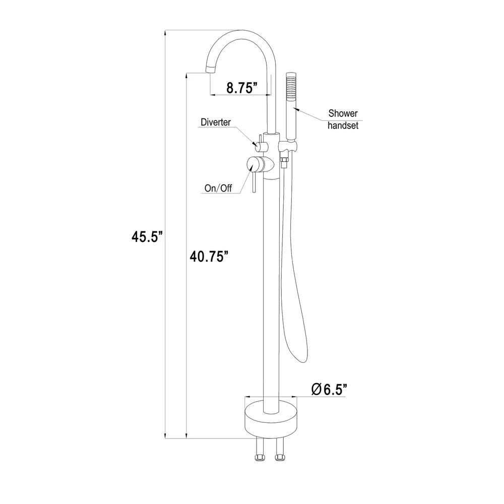 This AKDY 45.5 in. TF0042 freestanding bathtub filler brings tranquility and a blissful relaxing experience as you bask within your bathtub. This tub filler model comes in a beautiful matte black finish which is perfect for a more modern look for your bathroom design. It is made from brass and stainless-steel material providing durability. One lever are located on the left, giving you easy control of the flow of water and the temperature. The top lever controls the spout and wand, and the bottom lever controls the temperature. The handheld shower wand has a matching matte black handle with 67 nozzles to provide maximum water flow to a single direction. This gives you a more precise shower and more freedom with its 60 in. flexible hose. The height to spout is 40.75 and is perfect for any freestanding bathtub for a modern bathroom design. This product comes with a 1-Year Limited Parts Warranty as well as necessary mounting hardware.