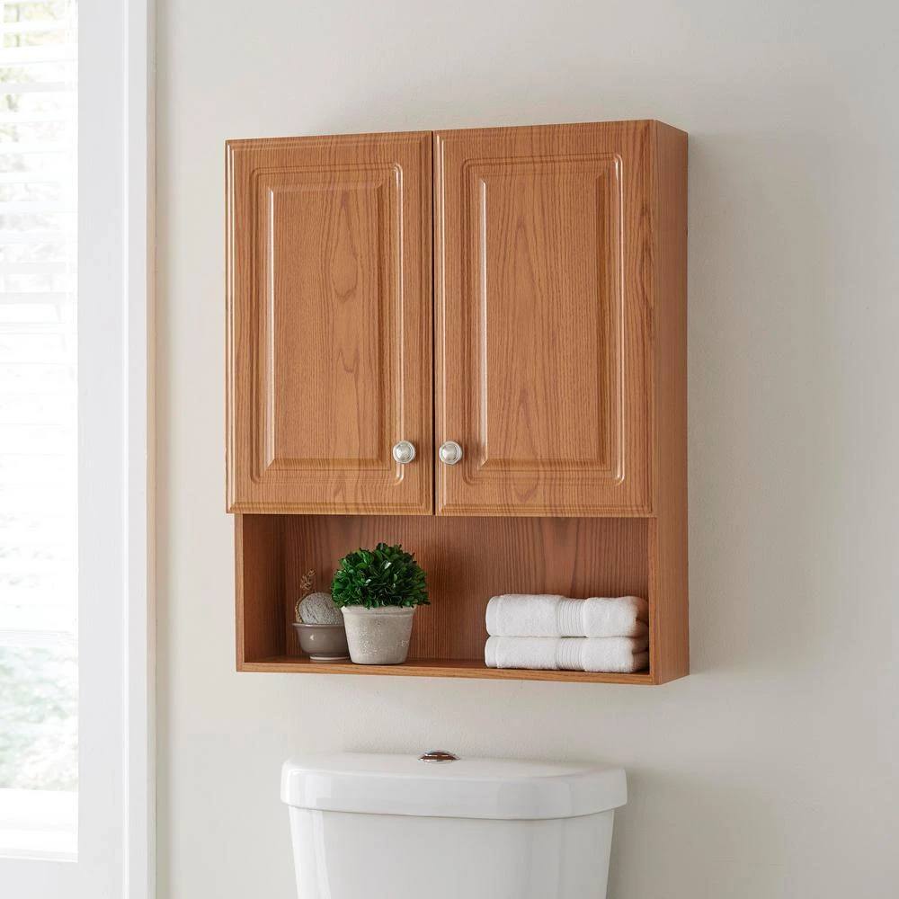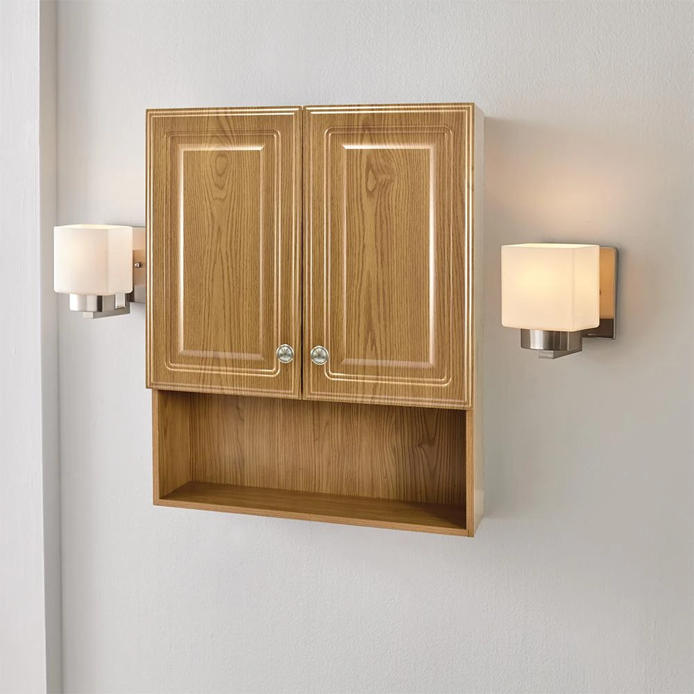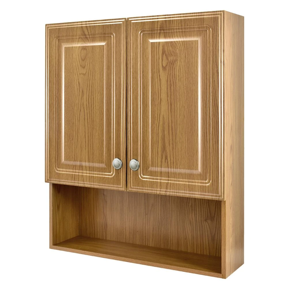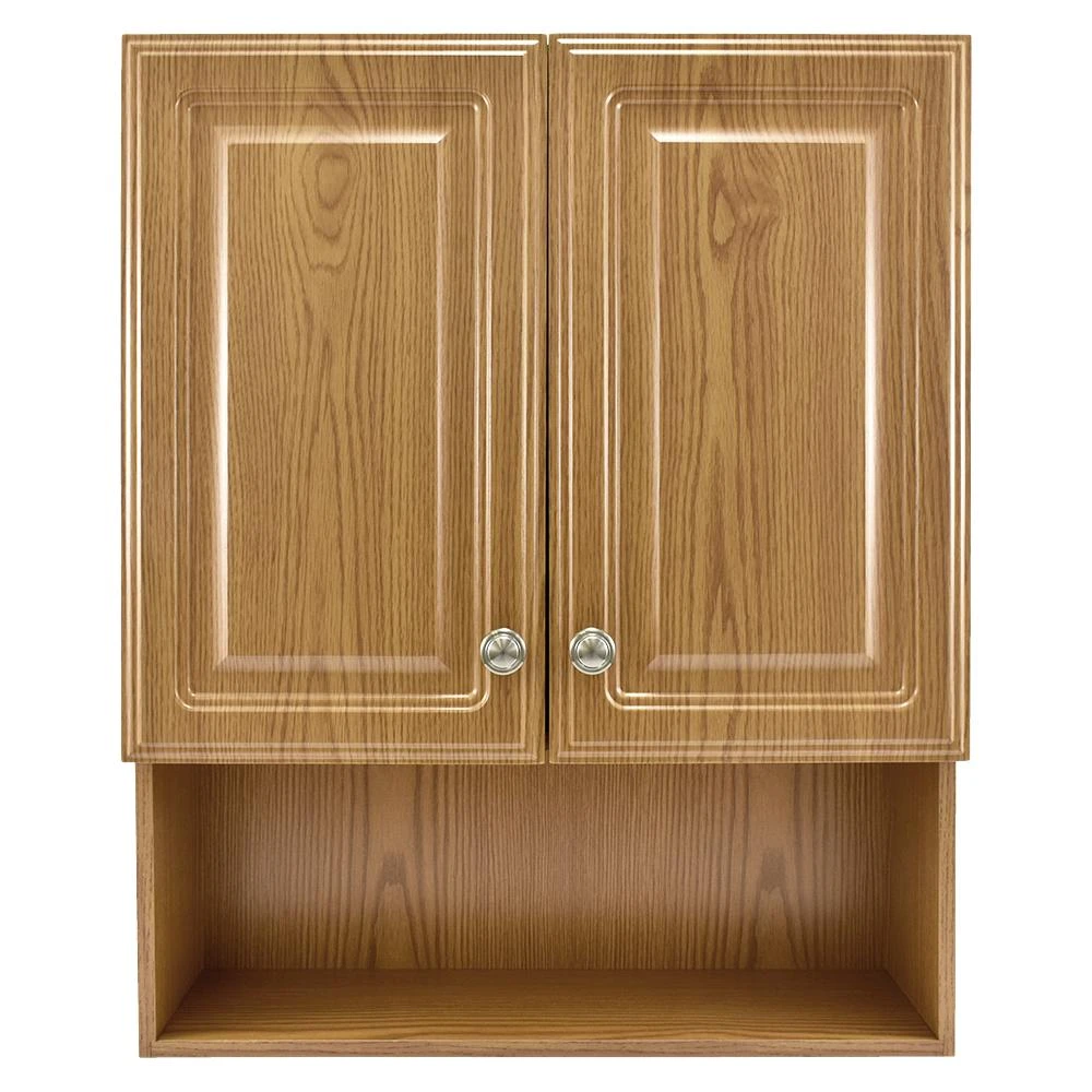 The Glacier Bay 23-1/8 in. W x 27-7/8 in. H x 7-1/2 in. D Oak Framed Surface-Mount Bathroom Medicine Cabinet is a great addition to your bathroom or powder room. The open shelf design provides an area to display decorative objects and the adjustable interior shelf gives you flexible storage space. Double shelf pegs make it quick and easy to customize your cabinet. Wood Composite construction provides exceptional durability and strength. Fully assembled for your convenience.