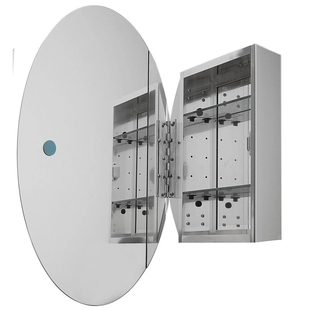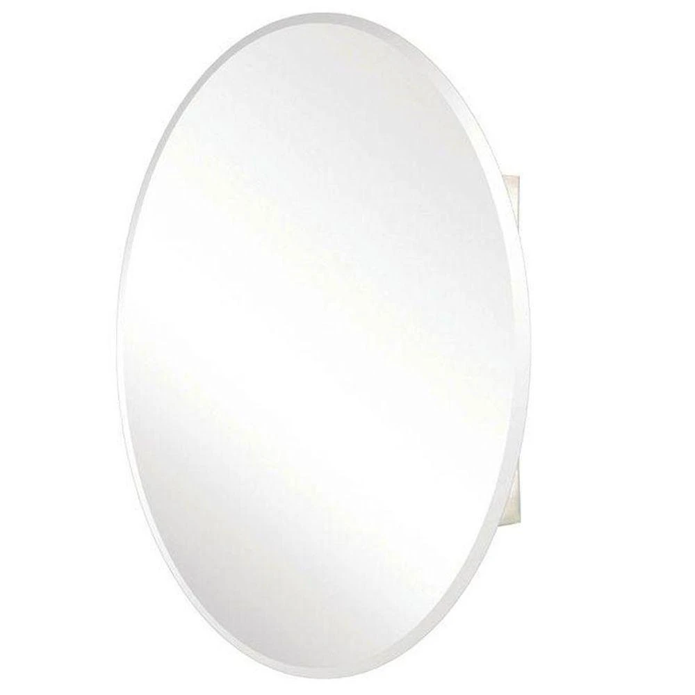 This mirrored cabinet features an oval beveled mirror door. Inside, the glass shelves hold all your toiletries and bath items. The aluminum construction with mirror back ensures years of use.
