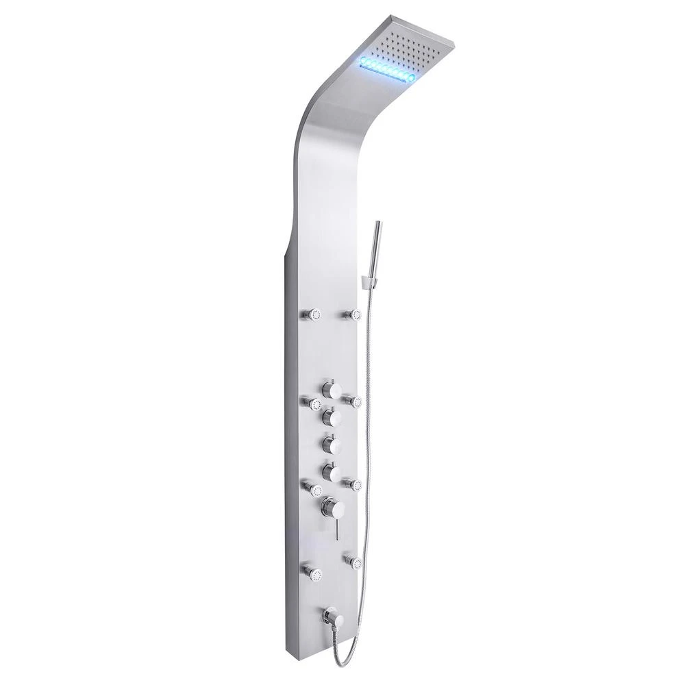 63 In. 8-Jet Shower Panel System In Stainless Steel With Rainfall Waterfall LED Shower Head And Hand Shower Wand