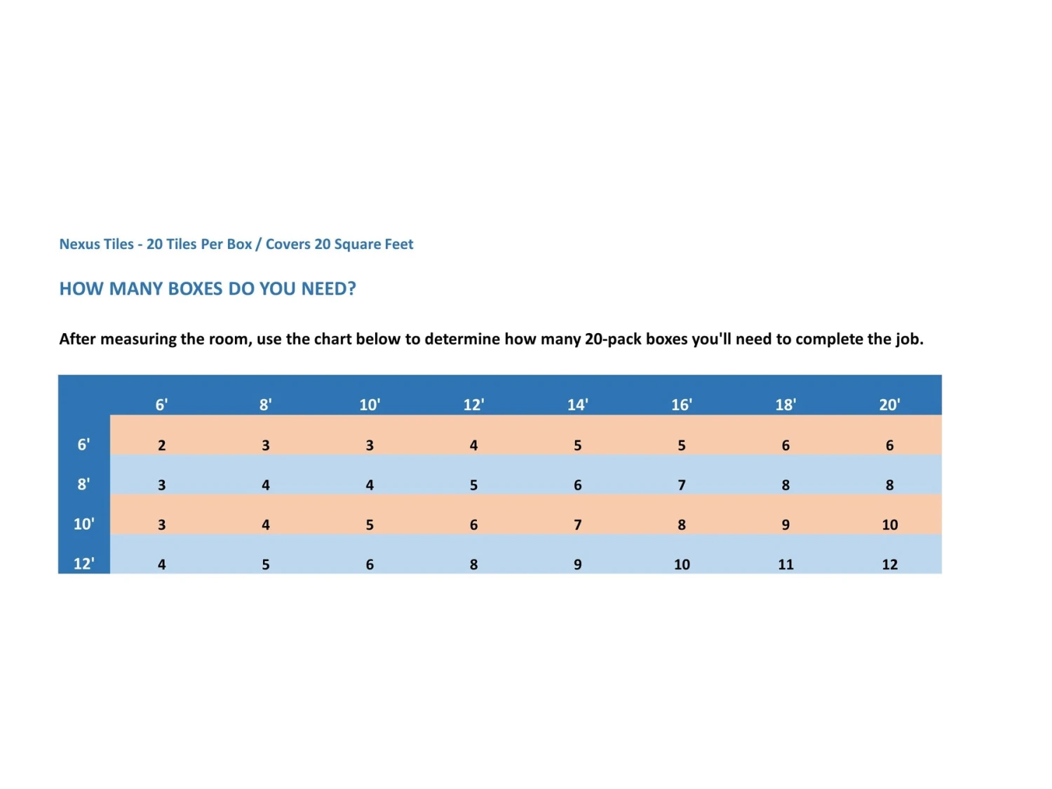 Do you want to give your home, office, or garage a brand new tile look and at a low cost without the mess Look no further than the Achim assortment of Vinyl Peel and Stick Nexus Tiles! Our water resistant tiles can be used in any room in your home including the Kitchen, Dining Room, Bedrooms, Bathrooms, Foyers and Basements. No messy glue or adhesives needed, just peel and stick the Nexus tiles to a flat and dry surface. In no time any room in your home will be transformed! Get ready to show off your beautiful new room to all your family and friends! This is the perfect Do It Yourself project to transform any room in your home! Our chart provided above tells you how many boxes of tiles you need to complete your project. Each tile is 1.2mm thick, giving a realistic tile finish and high quality texture.