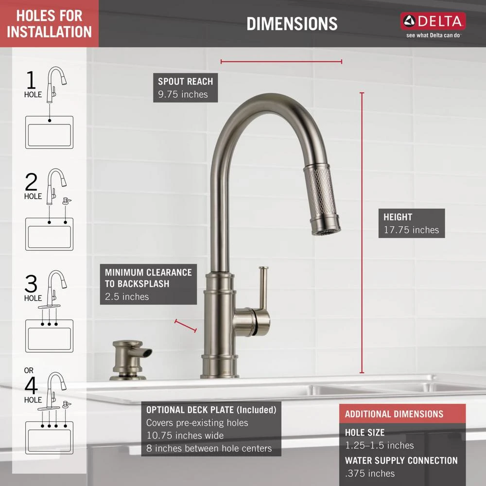 This Allentown Single-Handle Pull-Down Sprayer Kitchen Faucet with Soap in SpotShield Stainless beautifully combines aesthetics and technology. SpotShield Technology means less spots, less cleaning and antimicrobial protection of the finish. Unlike other pull-downs that tend to droop over time, MagnaTite docking keeps your Delta pull-down faucet looking picture-perfect. The pull-down spray wand comes free with a gentle tug and gives you total flexibility. The hose extends and retracts without friction points, fed by gravity. As you raise the wand to dock it, the magnet embedded in the spout pulls the wand precisely into place. Delta’s exclusive DIAMOND Seal Technology uses a valve with a tough diamond coating. InnoFlex PEX waterways keep water inside the faucet out of contact with potential metal contaminants.