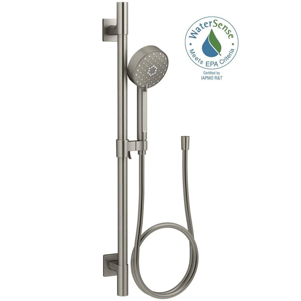 This all-in-one kit includes the Awaken G110 multifunction hand shower, a 24 in. slide bar and a 60 in. smooth hose. Advanced spray performance delivers 4 distinct sprays – wide coverage, intense drenching, targeted massage or reduced-flow spray -with a smooth rotation of a thumb tab. Ergonomic design makes for superior comfort and ease of use, with ideal balance and weight in the hand. The artfully sculpted spray face reveals simple, architectural forms that complement contemporary and minimalist baths.