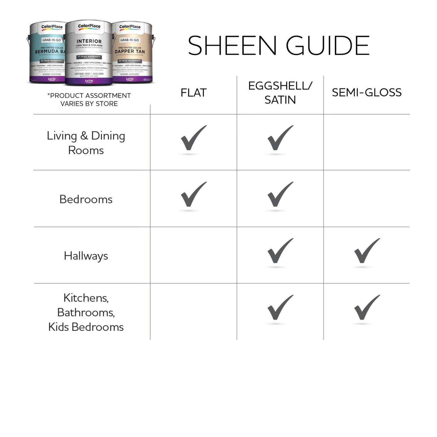 ColorPlace Pre Mixed Ready to Use Paints are ready-mixed (pre-tinted) paints, ready to go, available in a designer-inspired palette of top colors. These latex interior paints are a great value and a convenient option. Simply grab a can off the shelf and go with ColorPlacePre Mixed Ready to Use Paints. ColorPlace Pre Mixed Ready to Use Paint delivers a quick drying durable finish so you can get your space back to being enjoyed. ColorPlace Pre Mixed Ready to Use Paint provides easy application and easy clean up. Ideal for use on properly prepared interior walls, ceilings, or trim. Our suggestions for finish are as follows: a flat finish for living rooms and bedrooms; a satin finish for family rooms, kid’s rooms and hallways; and a semi-gloss finish for kitchens, bathrooms and hallways.ColorPlace Pre Mixed Interior Paint: