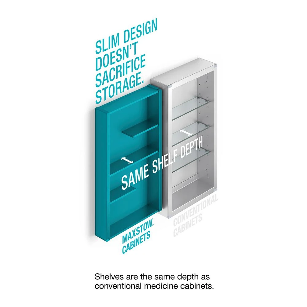 Maximize your bathroom storage with the Maxstow medicine cabinet. Staggered shelving holds tall and short items with no wasted space, fitting everything you need and keeping clutter off your countertop. The slim 3-1/2 in. -deep design provides the same internal storage space as traditional 5 in. -deep cabinets. Installation is fast and easy simply screw to the wall, right out of the box.