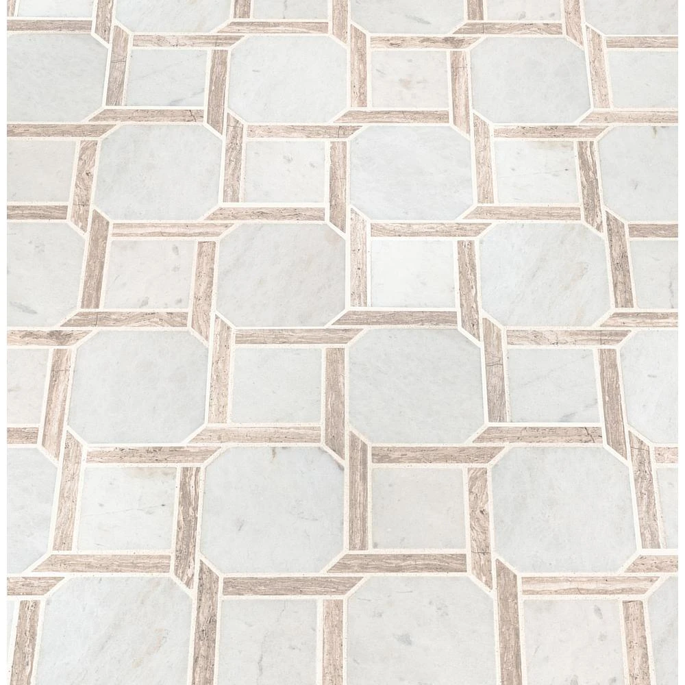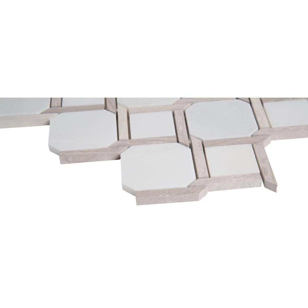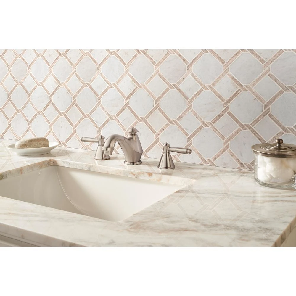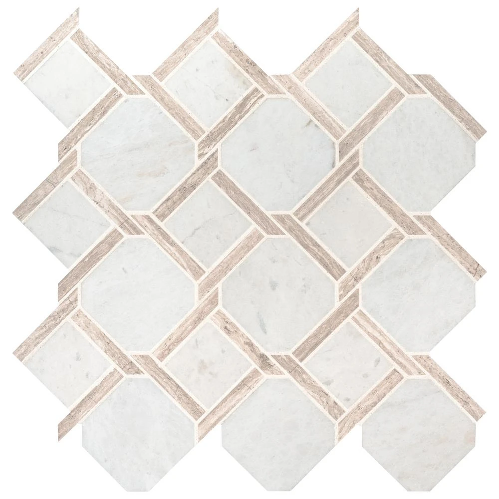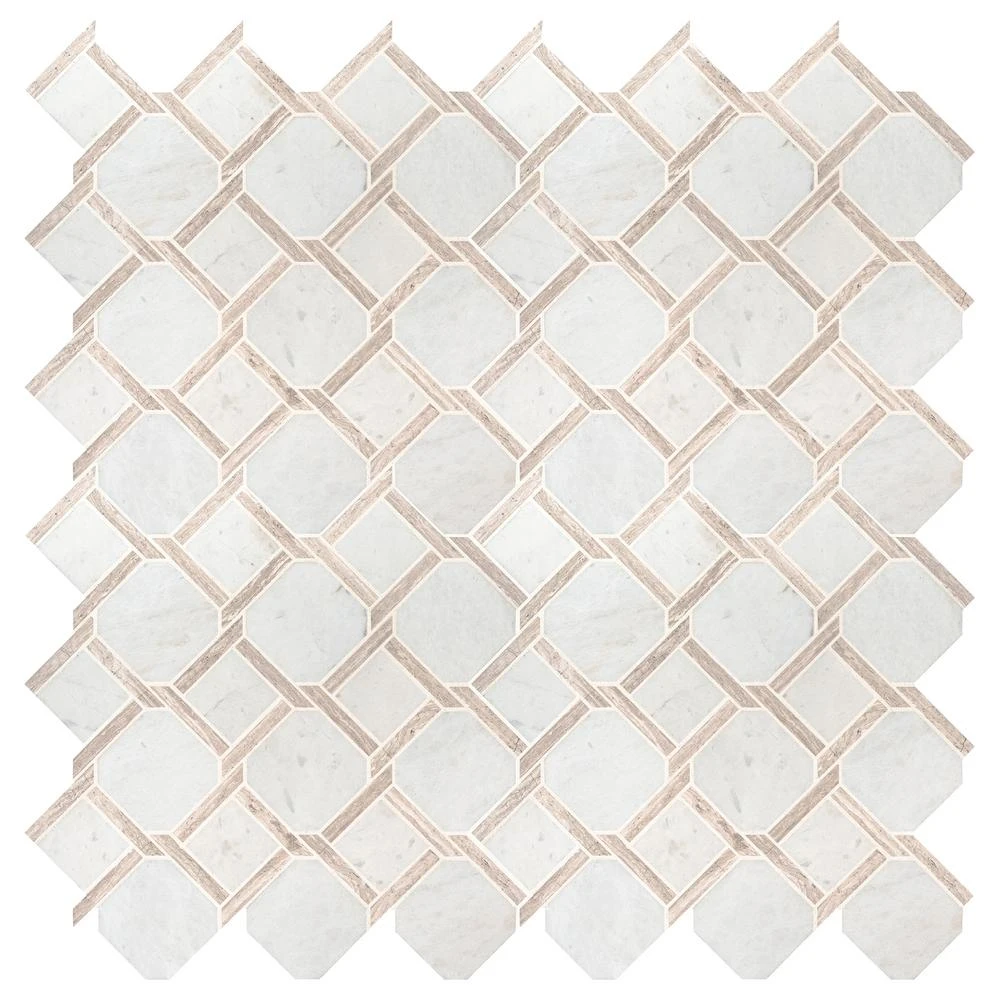 This Marbella Lynx Polished Marble Mosaic Floor and Wall Tile features uniquely-styled pieces of white Italian marble. It’s easy to install and is perfectly arranged on a 12 in. x 12 in. mesh-backed mosaic. This tile can add sophistication to a residential or commercial area with its high-sheen and smooth finish of genuine stone chips. The distinct pattern is certain to inject space-defining allure anywhere. It is recommended to blend tiles from different boxes as natural stone products can lack uniformity and are subject to variation in color, shade, finish, etc. Please inspect all tiles before installation; they may be characterized by dry seams and pits that are often filled. The filling can work its way out and it may be necessary to refill these voids as part of a normal maintenance procedure. All natural stone products should be sealed with a penetrating sealer.