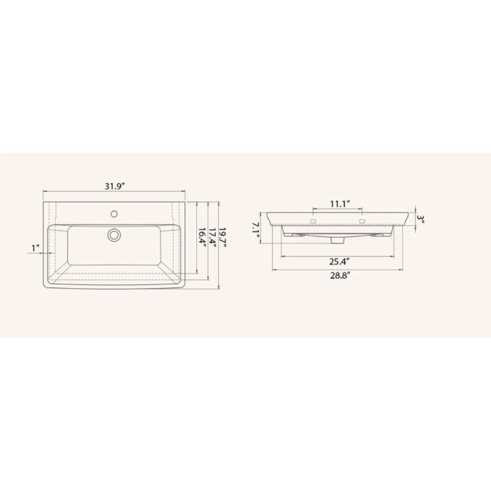 Rectangle white bathroom sink made from high quality ceramic. Contemporary style sink with wall mounted or self-rimming mounting. Sink has 1 pre-drilled faucet hole. Part of the CeraStyle Arica collection. Made in Turkey.