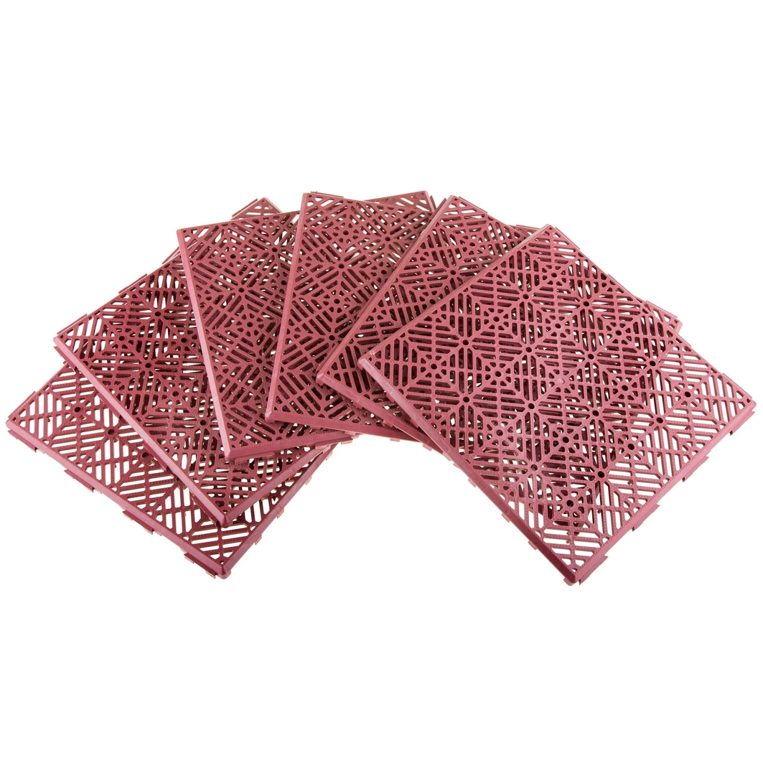 Made from strong polypropylene plastic, these tiles are easy to disassemble and clean. Each set creates a paved area of approximately 6 square feet. Combine multiple sets to create a larger area. Each set includes 6 tiles that will sit one half inch above a hard flat surface to allow a normal amount of water drainage underneath. Easy to install, no tools required.