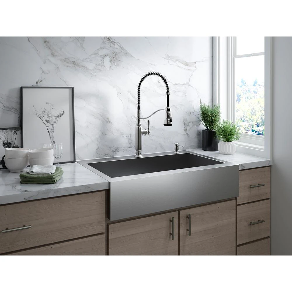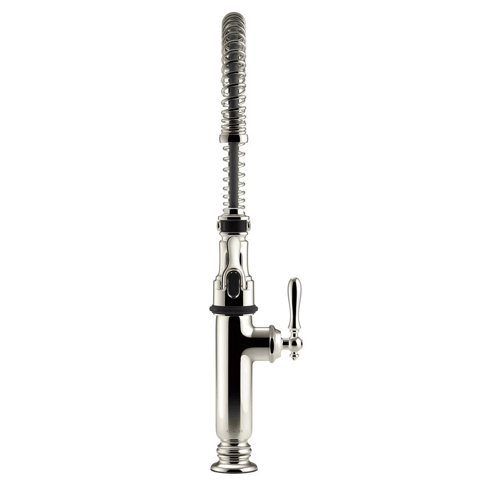 Designed with ambitious home chefs in mind, the Tournant faucet delivers elegant styling and professional performance to your kitchen. A unique three-function pull-down spray head lets you speed through a range of tasks: BerrySoft spray for food prep; an aerated stream for filling pots and pitchers; and Sweep spray for cleaning. The high-arching coil spring removes for easy cleaning.