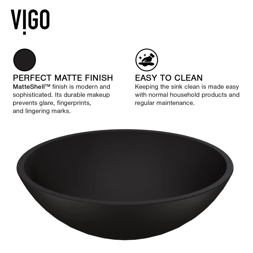 From deliberate design and pristine construction comes the VIGO Black Cavalli MatteShell Vessel Bathroom Sink. Innovative and intense, MatteShell sinks bring the same excellence of classic solid tempered glass sinks and take them to the next level. The Black Cavalli is deeply opaque and has an eggshell-like sheen that is rich yet subtle. Its deep ebony shade is infused into the sink itself, eliminating any risk of a chipped finish. The sink also has a fingerprint-free coating to prevent the appearance of marks. The Cavalli has a perfectly rounded shape with symmetrical dimensions. This design makes it easy to maintain and love in the home as a unique piece of functional art. Experience the synergy of character and style all in one with the VIGO Cavalli MatteShell.